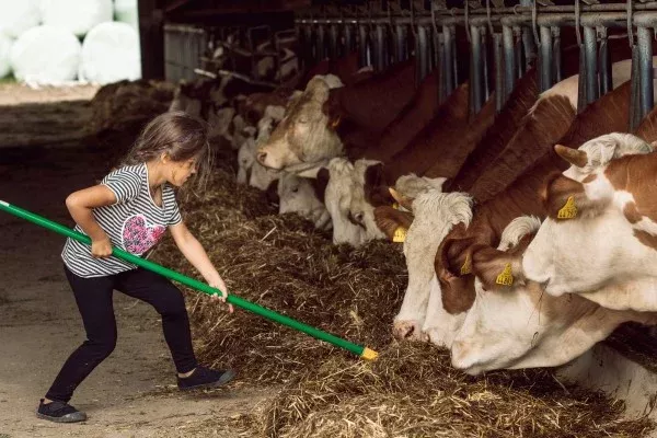 Jedes Kind darf Junior Simon beim Füttern der Kälber, Jungtiere und Kühe helfen!